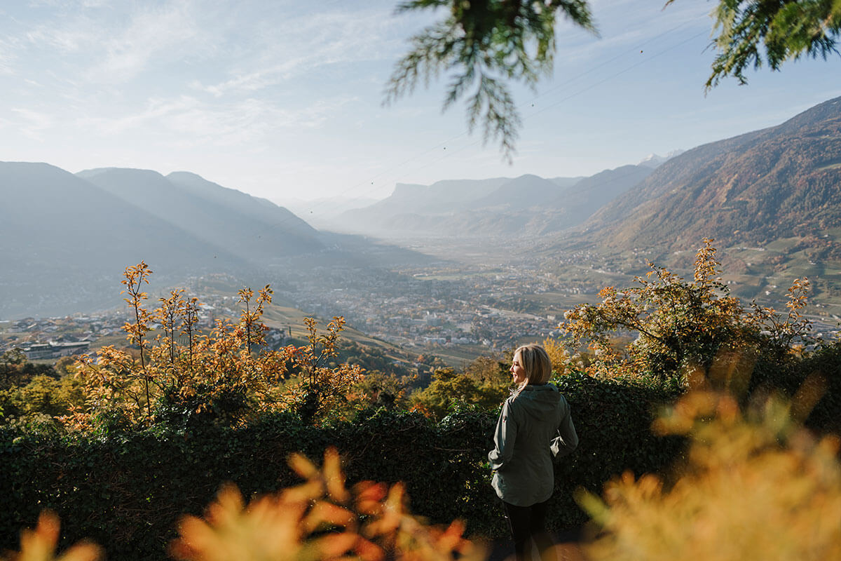 Weiter geht’s den Wanderweg hinauf zum Tiroler Kreuz, wo der Pfad in den Herrschaftsweg übergeht. Hier sollte man ruhig öfter mal anhalten und die Aussicht genießen – das Panorama ist ein echter Hingucker, besonders jetzt im Herbst, wenn die Landschaft wie ein Gemälde in Gold- und Rottönen leuchtet. Und schon bald taucht das nächste Ziel im Blickwinkel auf: das mächtige Schloss Tirol, das uns mit offenen Toren begrüßt.