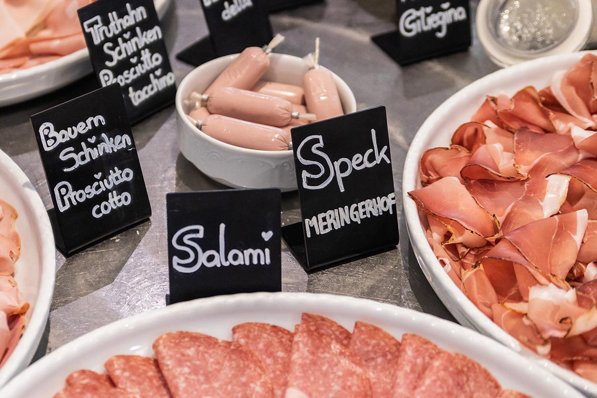 Das allermeiste von dem, was ich gerade aufgezählt habe, schafft es ganz ohne Umweg ins Hotel Lisetta, vieles bleibt sogar – sagen wir es einmal so – in der Familie. Schließlich sind es die Produkte unseres familieneigenen Meringerhofs, die unser Frühstücksbuffet bereichern.