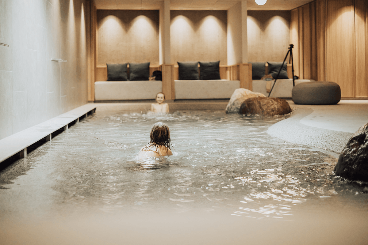 Qui si può sguazzare, giocare e ridere in tutta libertà. Senza il fastidioso odore di cloro, senza occhi che bruciano: la nostra acqua salina, naturalmente morbida e delicata sulla pelle, è particolarmente gentile anche con la pelle sensibile dei più piccoli.